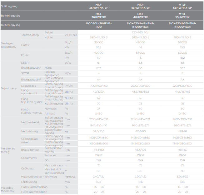 A Midea MTJ-48HWFNX-SP légcsatornázható split (R32, 14,1 kW) fontos tulajdonságai:
